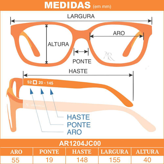 Conheça abaixo como são apresentadas as medidas desta armação para que você possa escolher o mais adequado ao seu rosto, lembre-se, todas as medidas apresentadas são em mm: