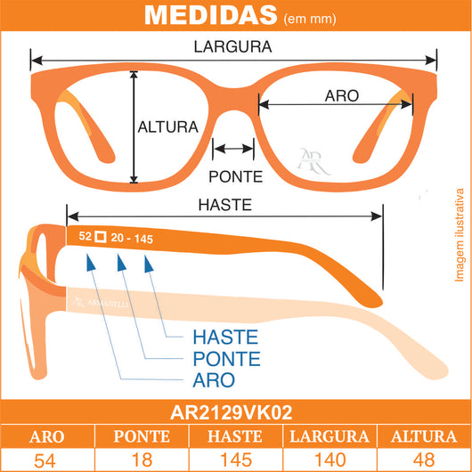 Conheça abaixo como são apresentadas as medidas desta armação para que você possa escolher o mais adequado ao seu rosto, lembre-se, todas as medidas apresentadas são em mm: