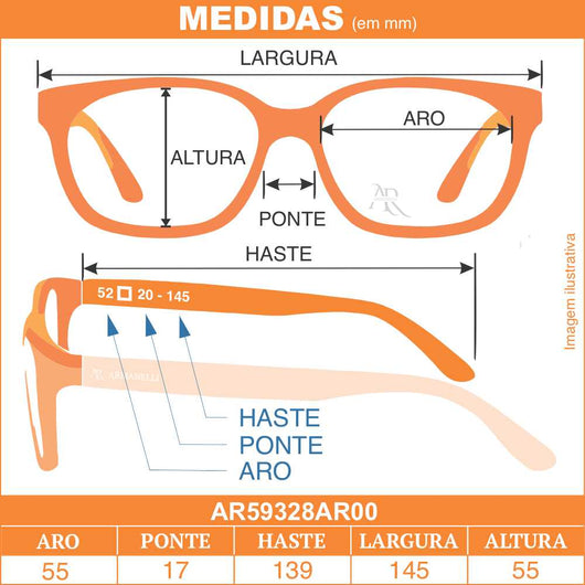 Conheça abaixo como são apresentadas as medidas desta armação para que você possa escolher o mais adequado ao seu rosto, lembre-se, todas as medidas apresentadas são em mm: