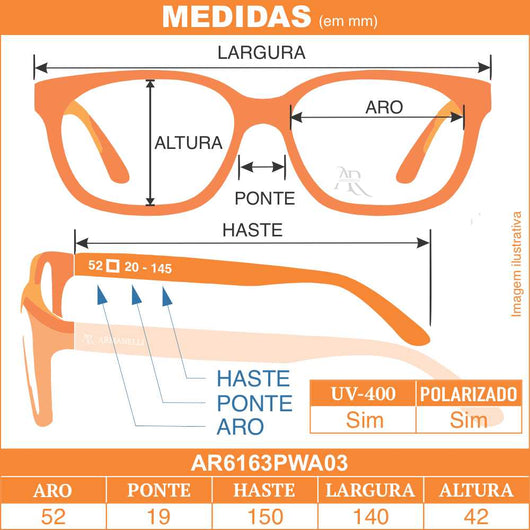 Conheça abaixo como são apresentadas as medidas desta armação para que você possa escolher o mais adequado ao seu rosto, lembre-se, todas as medidas apresentadas são em mm: